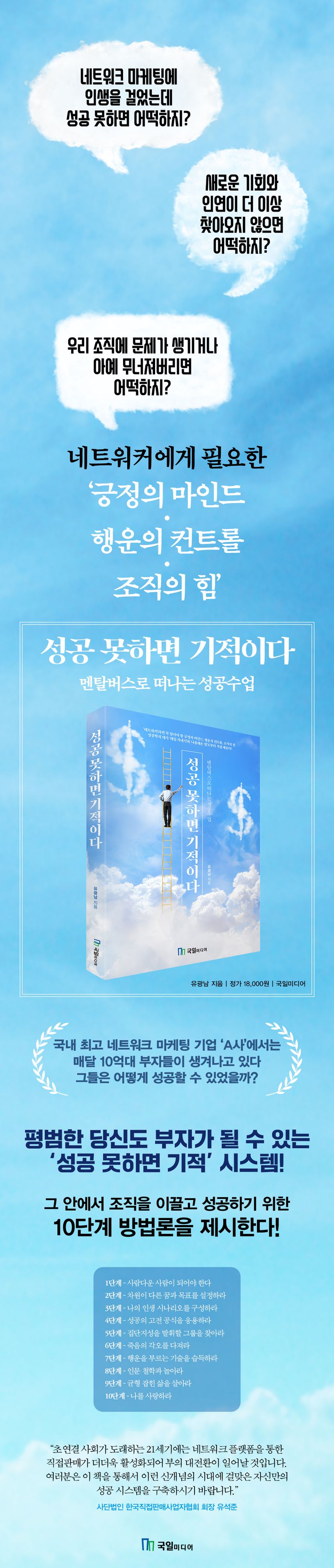네트워크 마케팅을 하는 사람이라면 세 가지 부분에서 불안을 느낀다. 첫 번째 불안은 ‘인생을 걸고 네트워크 마케팅 분야에 뛰어들었음에도 성공을 못하면 어떡하지?’ 하는 불안이다. 이러한 불안은 네트워크 마케팅에 확신이 없기 때문에 발생하는 것이다. 이 책은 당신에게 끊임없이 용기와 확신을 불어넣어주는 긍정의 마인드를 심어줄 것이다.