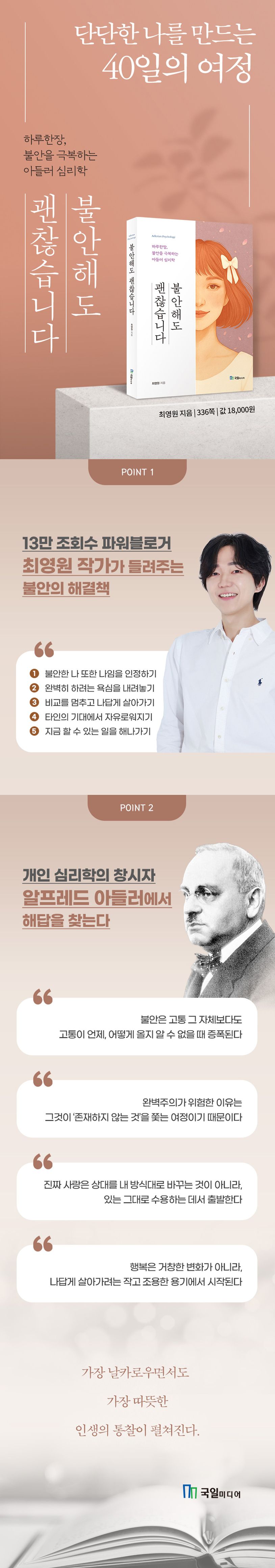 불안을 없애려 애쓰는 대신 그것을 삶의 동반자로 받아들이는 순간 우리는 비로소 자기 삶의 주인이 될 수 있다. ‘나는 이미 충분히 괜찮은 사람이다’라는 아들러의 통찰을 통해, 불안을 삶의 걸림돌이 아닌 나만의 길을 밝혀주는 나침반으로 바꿔보기 바란다.