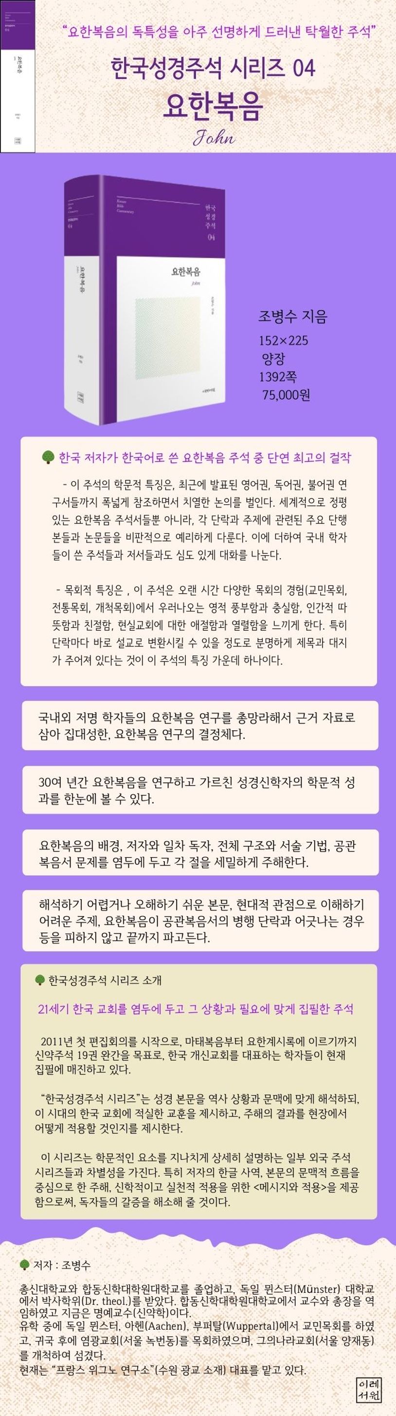 이레서원 〈한국성경주석 시리즈〉의 세 번째 책 『요한복음』은 헬라어 원문에 충실하게 엄밀한 본문 번역을 시도함으로써, 기존 한역과 차별화된 사역으로 요한복음을 풀어낸다. 또한 저자만의 독특한 문체와 글쓰기 기법은 더욱 탄탄하고 밀도 있는 시선으로 요한복음을 들여다보게 해 준다.