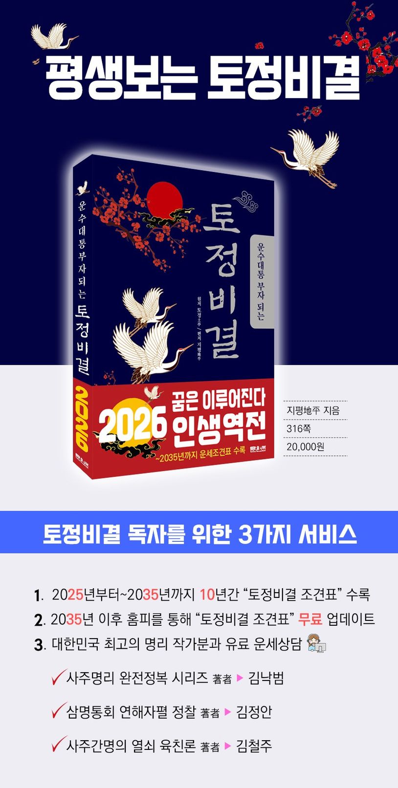 향후 10년간 운세를 찾아볼 수 있는 조견표가 수록된 토정비결이다. 이후에도 자신의 신년 운세를 볼 수 있도록 홈피를 통해 지속적으로 조견표를 무료 업데이트 서비스를 하여 평생 볼 수 있다. 또한, 대한민국 최고의 명리 작가분과 유료 인생상담을 할 수 있도록 출판사를 통해 연결해 드리는 이벤트를 함께 진행한다.