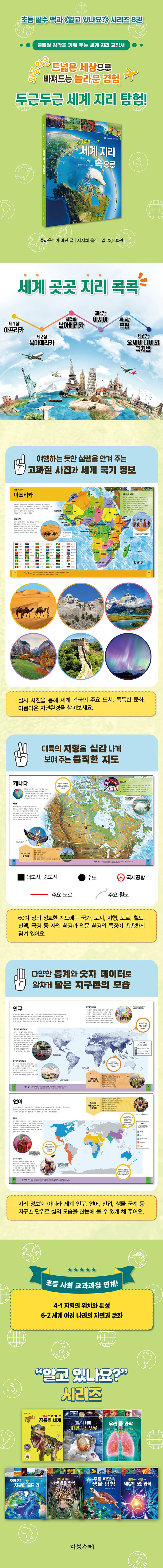 딱딱한 용어, 복잡한 기호가 가득한 지도는 어린이들이 보기에 분명 어렵고 지루하다. 하지만 자세히 들여다보면 지형과 길, 주요 도시 같은 표면적 정보 외에도 수많은 이야기가 담겨 있다. 기후, 생물, 자연환경, 도시, 교통, 주민, 산업 등 우리를 둘러싸고 있는 이 세계가 어떤 모습이며, 어떻게 움직이고 있는지 알려 주는 거대한 데이터인 것이다. 이 책은 감탄이 절로 나오는 정교한 지도 60여 장과 고화질의 실사 사진, 각 지역에 대한 유익한 정보를 깨알같이 담아 세계의 지리, 문화, 역사를 흥미롭게 배울 수 있도록 구성되어 있다. 동시에 드넓은 세계에 대한 호기심과 글로벌 감각도 함께 키울 수 있는 알찬 지리 교양서이다.