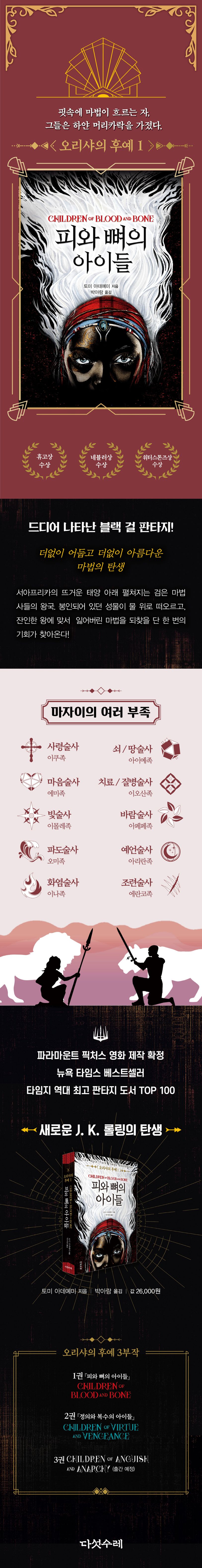 113주 연속 USA 뉴욕 타임스 베스트셀러 자리를 지킨 대단한 소설이다. 아마존에 13,000개 이상의 리뷰가 올라왔을 뿐 아니라 스티븐 킹, 록산 게이 등 걸출한 작가들에게도 극찬을 받았다. 아프리카 신화를 기반으로 매력적인 마법 세계가 펼쳐지는 가운데 여성 히어로의 활약이 두드러진다. 더불어 불평등한 현실 세계에 대한 예리한 비판이 돋보인다.