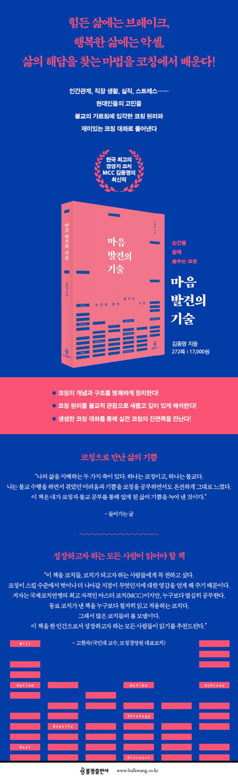 이 책은 코칭을 단순한 스킬이라는 관점을 넘어 불교의 가르침이라는 관점에서 명쾌하고 흥미롭게 풀어낸다. 코칭을 공부하는 이들은 물론, 불교에 관심을 가진 이들도 이 책에서 많은 것을 배울 수 있다. 코칭을 공부하는 이들은 이 책을 읽으면서 코칭의 개념과 구조를 일목요연하게 파악하고, 나아가 그것을 불교의 언어로 새롭게 이해할 수 있을 것이다. 불교에 관심을 가진 이들은 이 책을 읽으면서 불교의 추상적인 가르침이 어떻게 대화라는 구체적이고 일상적 행위로 실천될 수 있는지 확인할 수 있을 것이다.