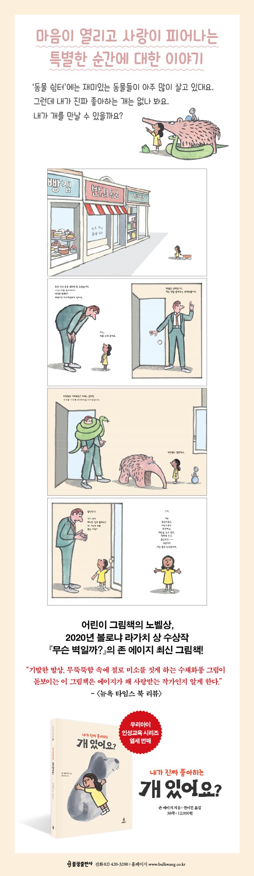 반려동물 센터인 ‘모두 안녕 동물 쉼터’에는 많은 동물들이 모여 살고 있어요. 그곳에 한 아이가 찾아와요. 아이는 이곳에서 개를 데리고 집으로 갈 생각이었죠. 개를 진짜 좋아하거든요. 그런데 쉼터지기 아저씨는 개를 보여 달라는 아이 앞에 자꾸만 엉뚱한 동물을 데리고 나타나요. 개미핥기, 아기원숭이, 개구리, 비단뱀…, 아이는 좀 화가 났어요. ‘내가 좋아하는 건 개라고요!’
