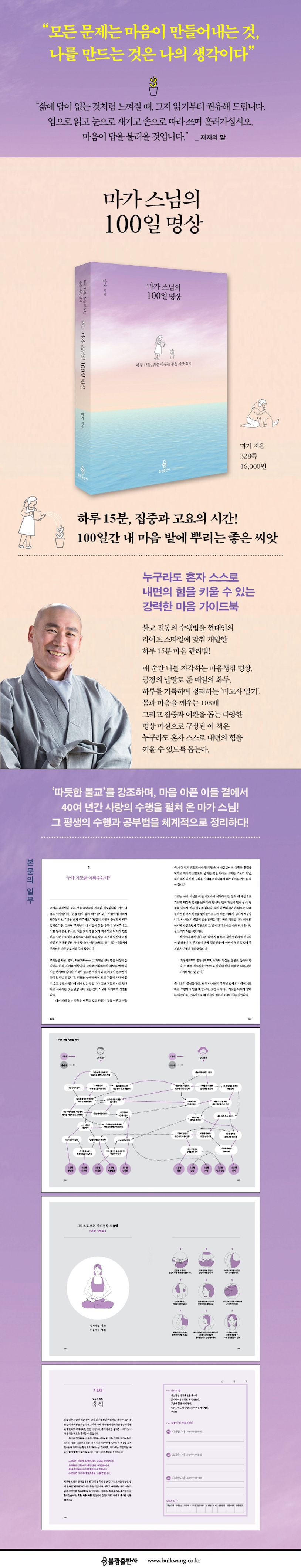 이 책은 왜 마음의 고통이 반복되는지 ‘괴로움의 뿌리’를 살펴보고, 이를 없애기 위해 석가모니 시대부터 이어져 온 전통적 수행의 종류와 방법 그리고 나에게 맞는 수행법까지, 마음공부의 핵심을 꿰고 있다. 이론적 토대와 이를 아우르는 실천편은 하루 15분, 100일 간의 수행으로 구성되어 있다. 마음의 구조에 대한 올바른 이해를 바탕으로 지혜를 계발하고, 여기에 꾸준한 실천이 더해져야 비로소 완벽한 마음 수행, 즉 ‘매 순간 있는 그대로의 행복’을 느낄 수 있는 것이다. 삶은 한 번의 깨달음으로 변화되는 것이 아니라, 러닝머신처럼 마음을 지속적으로 돌보는 데 있다는 마가 스님, 이 책은 40여 년의 수행으로 터득한 저자의 오랜 마음공부법이 고스란히 녹아 있다.