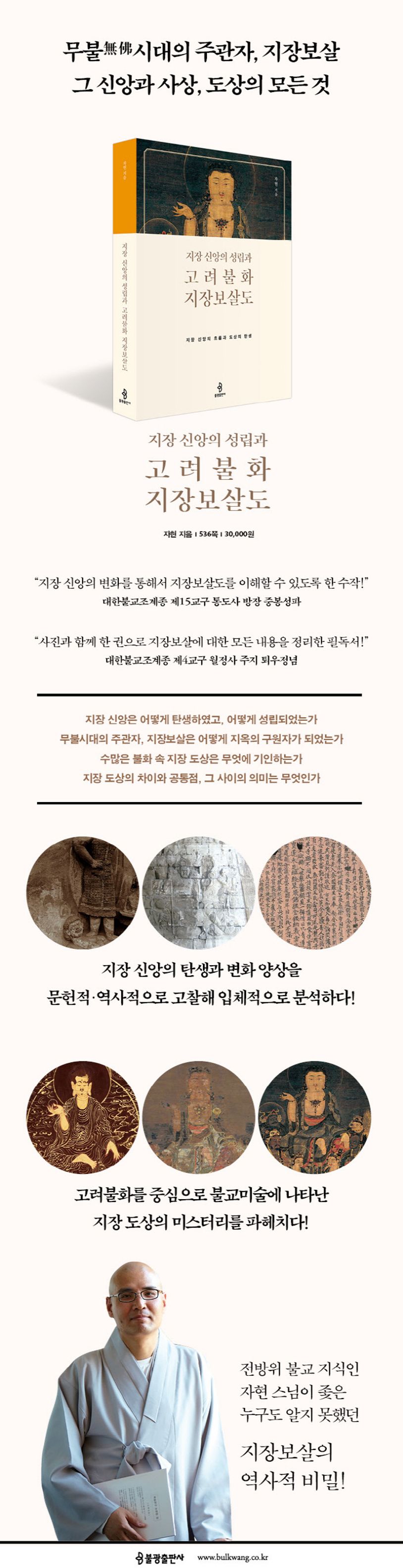 저자 자현 스님은 이 책에서 ‘지장보살의 거의 모든 것’을 좇고 있다. 인도로부터 시작돼 실크로드 그리고 중국불교 문화권을 넘어서는 지장 신앙의 거대한 역사적 지문(指紋)을 추적한다. 지장 신앙의 탄생과 성립, 변화 양상과 사상을 관련한 기록과 경전 등의 문헌은 물론 현존하는 유물 등을 통해 분석하고, 이를 불화에 나타난 지장보살 도상에 비추어 살피며 감춰져 있던 지장보살의 미스터리를 낱낱이 파헤친다. 저자의 탁월한 식견과 혜안으로 만나는 ‘지장보살’은 오늘날 신앙과 사상으로서 어떤 가치가 있는지 그 위상을 새롭게 자리매김한다.