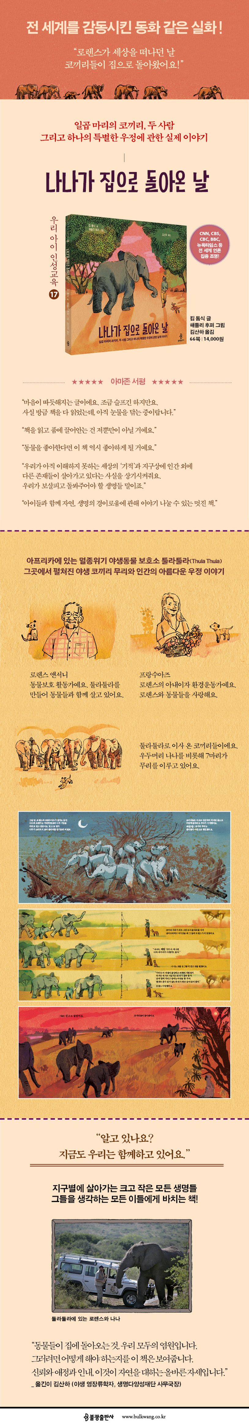 이 책은 동물보호 운동가이자 환경운동가로 헌신한 로렌스 앤서니와 야생 코끼리들의 우정을 그린, 실화를 바탕으로 한 그림책입니다. 1999년 사살될 위기에 놓인 야생 코끼리들이 있다는 소식을 들은 로렌스가 그들은 입양하면서 시작된 이야기죠. 이들의 이야기는 전 세계인들에게 커다란 감동을 선사했습니다. 특히 로렌스가 세상을 떠나던 날 코끼리들이 보여준 놀라운 행동은 생명의 경이로움과 종을 뛰어넘어 마음을 나누는 것의 의미를 되새기게 했습니다.