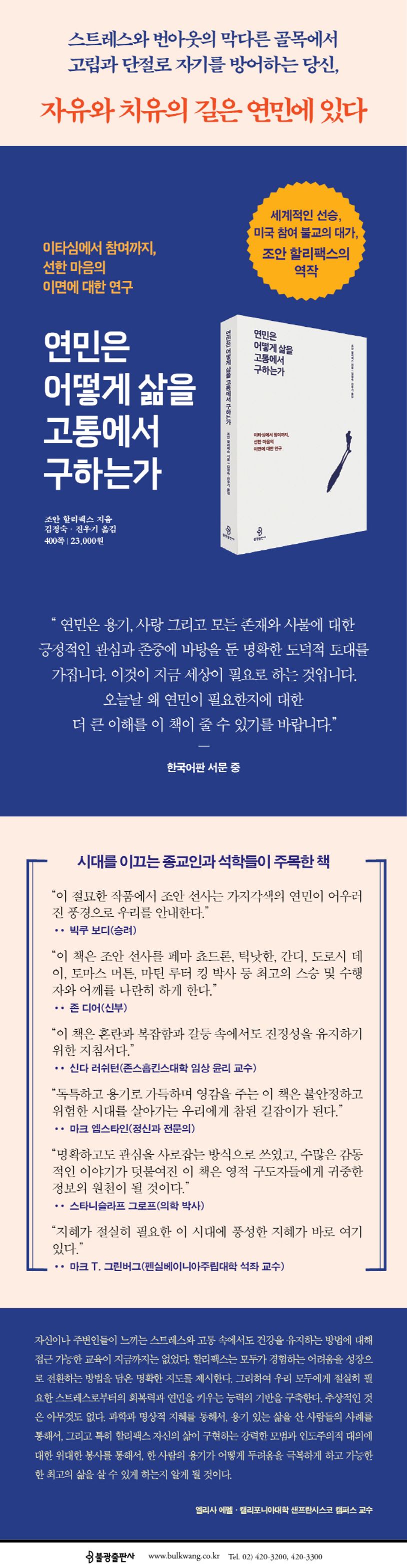 이기적으로 사는 것이 자기 치유의 수단이 되는 시대에 조안 할리팩스의 권유는 이상적인 꿈 같기도 하고 동화 같기도 하다. 하지만 과연 그럴까? 저자의 생애는 타인을 향한 연민의 여정이었다. 그 여정은 인간의 마음에 대한 신경 과학적인 탐구이기도 했고, 죽어가는 이들의 삶과 사형수들의 삶과 고통에 시달리는 이들의 삶을 어루만지는 치열한 실천이기도 했다. 그 기나긴 여정을 통해 저자는 타인을 향한 연민이야말로 자기를 치유하고 나아가 이 세상을 치유하는 수단이 될 수 있음을 몸소 입증해 왔다.