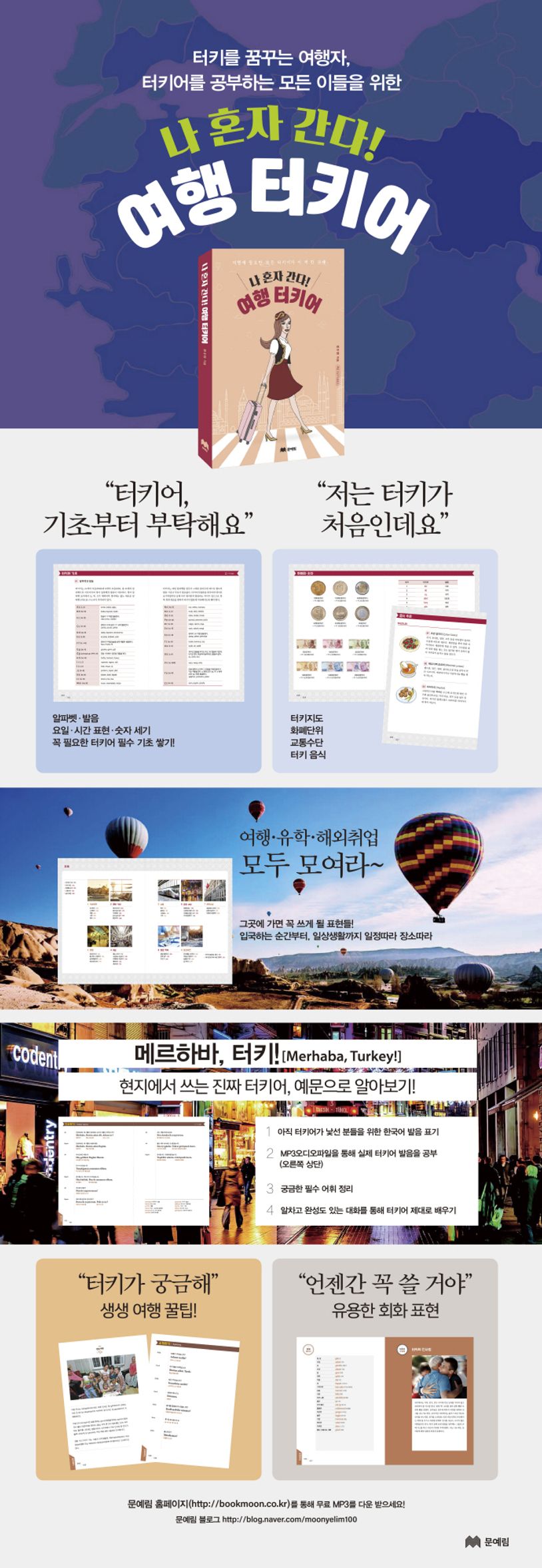이 책 한 권만 있으면 나 혼자 터키 여행 갈 수 있습니다. 터키 사람들은 느긋하게 차 마시기를 좋아하죠. 뭐든 빨리빨리 해야 하는 우리나라 일상에 지친다면, 오랜 세월 중앙아시아 초원에서부터 광대한 오스만제국을 지배했던 매력적인 나라 터키로 떠나 보세요. 여행을 한다거나 또는 학교에 다니거나 일을 하게 됐을 때도 이 책 한 권 들고 그냥 떠나세요. 현지에서 바로 써먹을 수 있는 표현이 가득합니다!