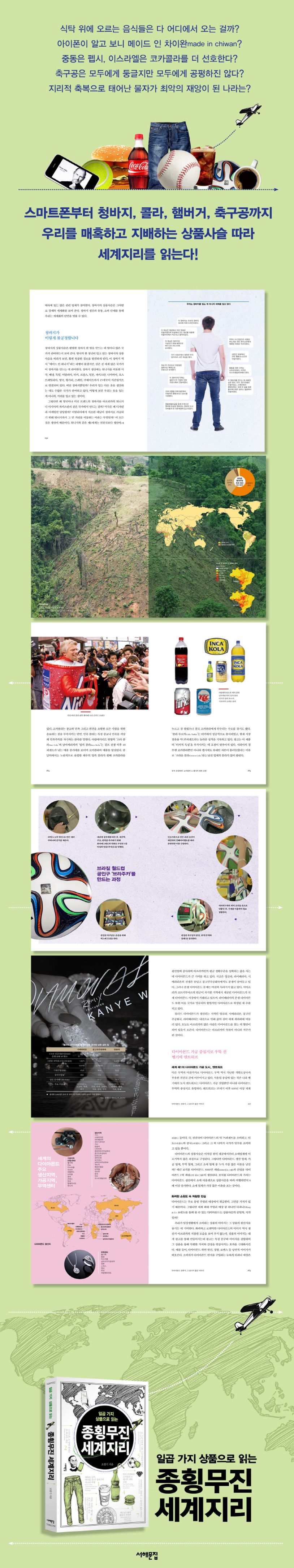 우리가 일상에서 매일 접하는 상품의 원료부터 원산지, 생간과 가공, 유통, 소비 과정을 추적하면서 촘촘하게 연결된 세계를 종횡무진 펼쳐 보이는 『종횡무진 세계지리』. 축구공부터 스마트폰, 햄버거, 콜라, 커피, 다이아몬드, 청바지까지 넓디넓은 지구를 복잡한 경로를 통해 이동하는 일곱 가지의 상품들을 통해 세계지리를 읽어본다.