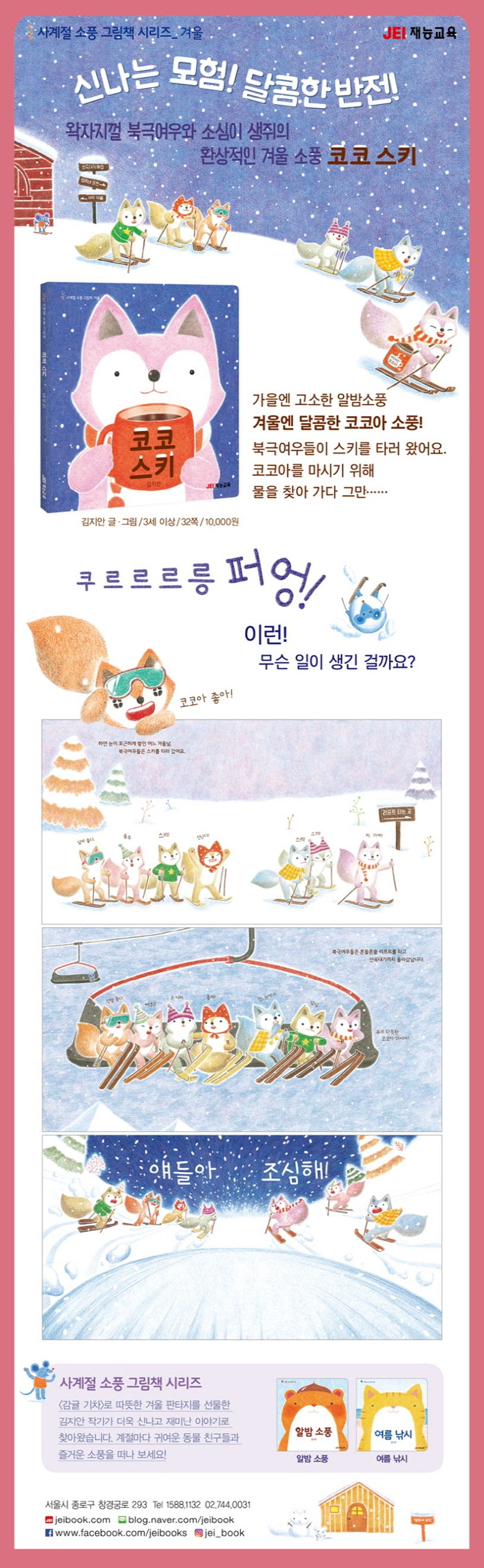 〈감귤 기차〉로 따뜻한 겨울 판타지를 선물한 김지안 작가가 한층 사랑스러운 주인공과 유쾌한 이야기로 찾아왔습니다. 바로, 사계절 소풍 시리즈 중 겨울편으로 〈코코 스키〉는 활기찬 북극여우들의 신나는 코코아 대소동을 담았습니다. 계절마다 귀여운 동물 친구들과 신나는 소풍을 떠나 보세요!