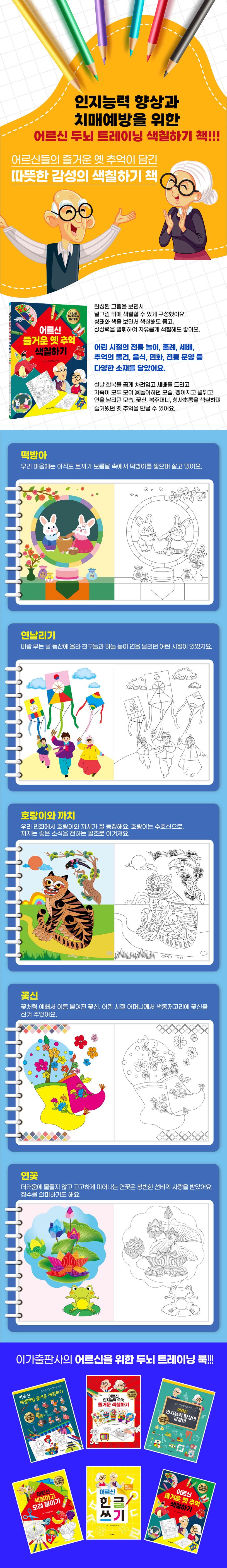 『어르신 즐거운 옛 추억 색칠하기』는 여가 시간에 즐겁게 색칠하면서 인지능력 향상의 효과뿐만 아니라 결과물을 통한 성취감과 자신감의 회복도 누릴 수 있을 것입니다.