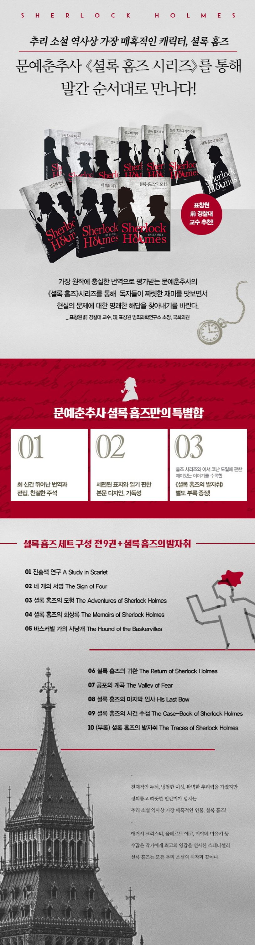 최 신간 번역으로 만나는 문예춘추사 《셜록 홈즈 시리즈》는 세련된 표지와 읽기 편한 본문 디자인, 가독성 뛰어난 번역과 편집, 친절한 주석으로 인해 많은 독자들에게 만족감을 선사한다. 또한 《셜록 홈즈》전집에는 별도 부록으로 제작한 《셜록 홈즈의 발자취》를 통해 《셜록 홈즈 시리즈》와 ‘아서 코난 도일’에 관한 재미있는 이야기들이 독자들의 궁금증을 해결해준다.
