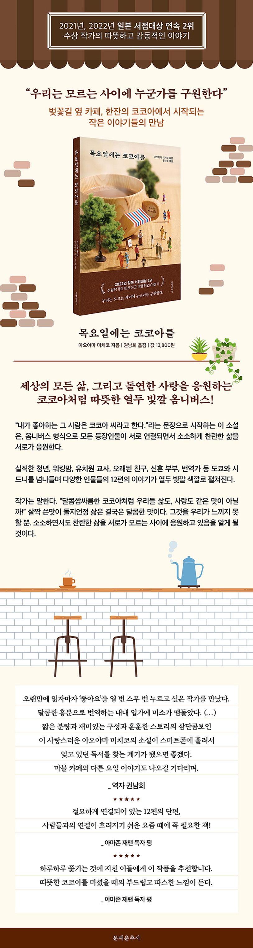 《목요일에는 코코아를》은 2021년 서점대상 2위에 오른 작가 ‘아오야마 미치코’ 데뷔작으로 ‘마블 카페’에서 한잔의 코코아로부터 이야기가 시작되어 도쿄와 호주의 시드니를 배경으로 각각 6편, 총 12편의 연작 단편이 실려 있는 소설이다.
