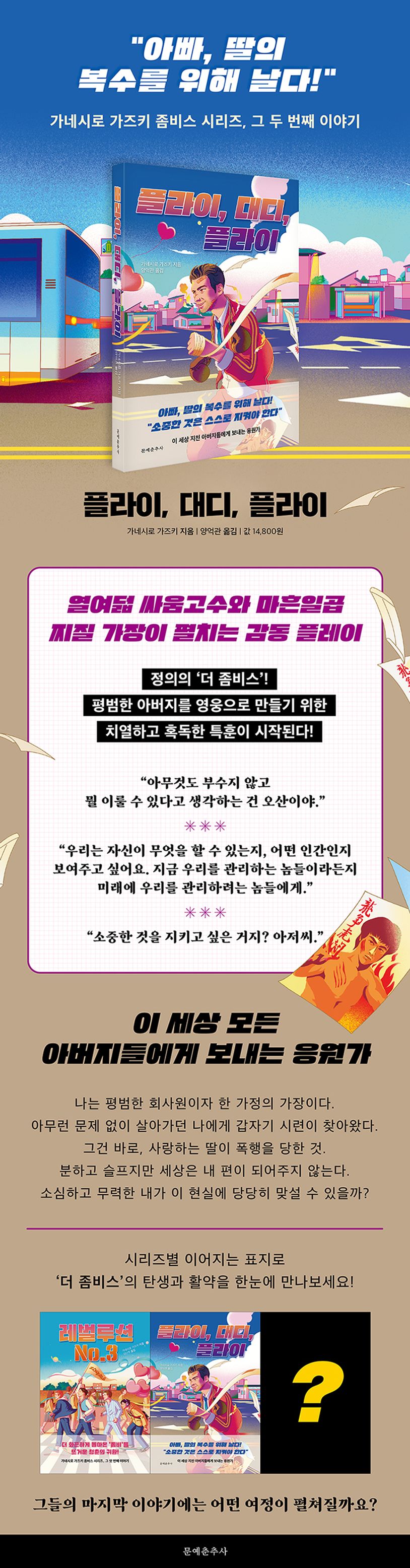레벌루션 No. 3』에 이어 가네시로 가즈키의 장편소설 『플라이 대디 플라이』가 개정 출간되었다. 『레벌루션 No. 3』의 ‘더 좀비스’ 주요 인물이 그대로 등장하는 이번 이야기는 ‘아버지의 대활약’이 중심축이다. 아버지의 분노와 ‘더 좀비스’ 정의의 합작품이라고나 할까. 일본사회의 중심영역이 구사하는 사회적 약자, 주변인, 소수민족에 대한 구조적이면서 관습적인 폭력을, 그 주변을 살아가는 너무도 무력한 ‘고삐리’ 팀이 통괘하게 깨부수는 이야기다.