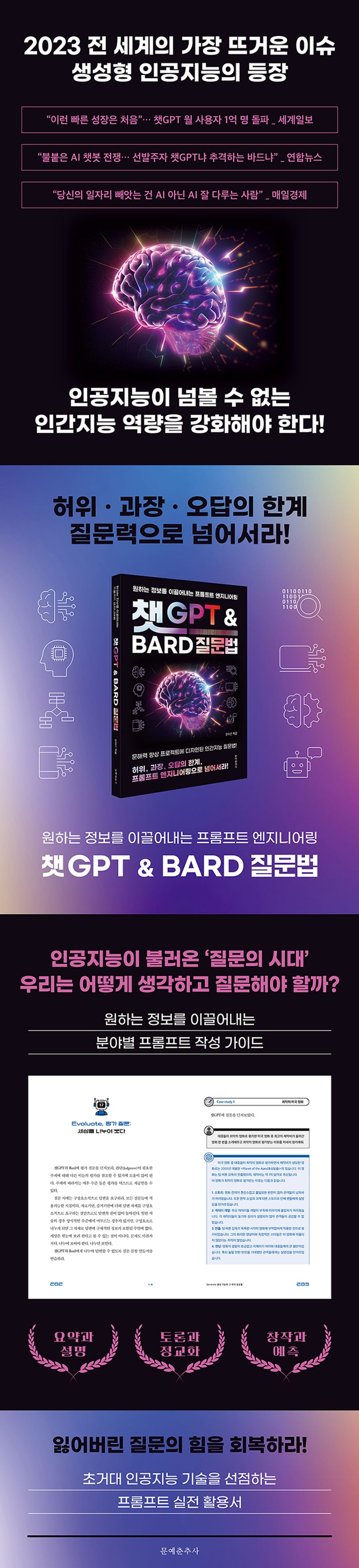 또한 《챗GPT와 Bard 질문법》은 인공지능 시대를 주도적으로 살아갈 수 있는 원천역량을 세우는 일에 집중한다. 책에 소개하는 다양한 질문법 프로세스를 적용, 실행하고 그 노력을 지속한다면 이러한 목표는 꿈이 아닌 현실이 될 것이다.