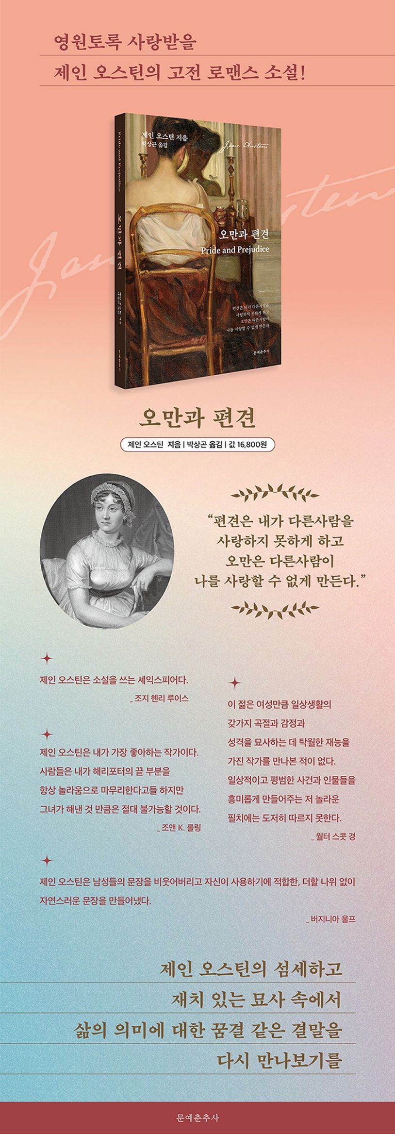 《오만과 편견》은 영국 근대 문학을 대표하며 영국인이 가장 사랑하는 작가 제인 오스틴의 작품이다. 19세기 영국의 결혼관과 사회상을 풍자하며 여성들의 삶을 섬세하게 묘사했다.