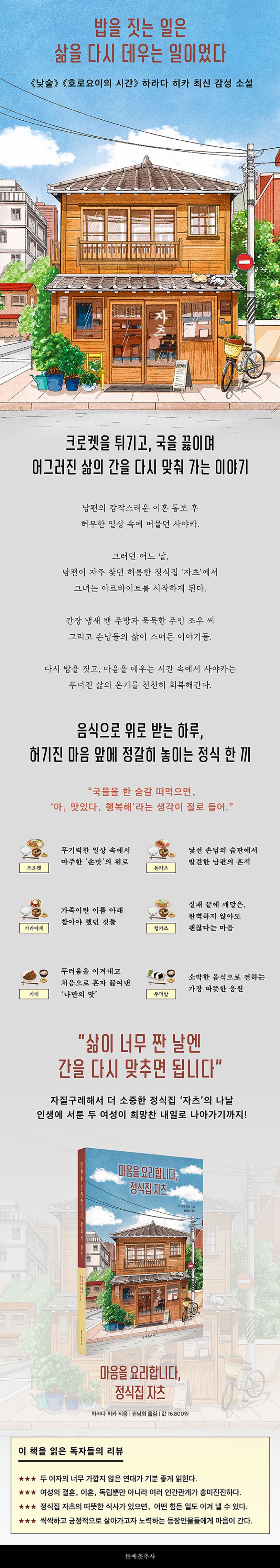 자라온 환경이 다른 두 여성이 서로의 장점을 살려 맞닥뜨린 어려움을 극복하고 ‘맛’으로 뭉치는 이야기, 《마음을 요리합니다, 정식집 자츠》는 그녀들이 만들어낸 ‘맛’으로 독자들까지도 치유받는 느낌 물씬한 ‘맛있는’ 소설이다.