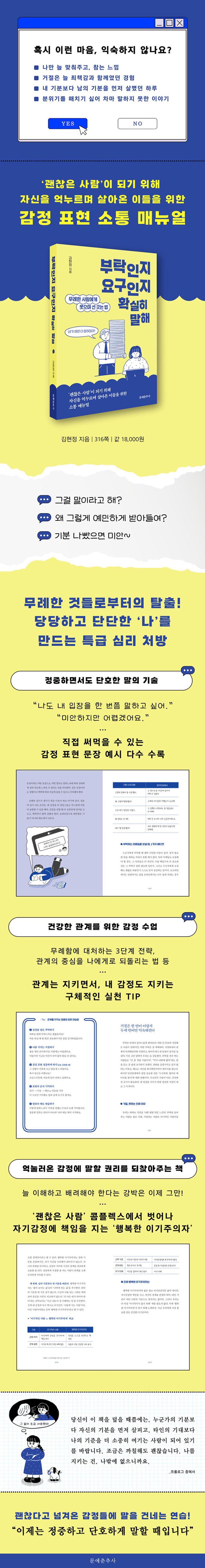 프롤로그004Part1.나는인간관계에서투른사람일까?인간관계는왜어려운걸까?012내가화난건오해이고다른사람화는내잘못?023참고기다리면내마음을알아줄줄알았는데033기브앤테이크는바라지도않아043너는그래?나는안그래!054Part2.무례한사람들의흔한특징왜네멋대로내마음을판단해?066익숙함에빠져소중함을잊는사람076네가알것까지없어087‘다널위해서야’,조언이라지만사실은지적질098어떻게나한테그럴수있어?109Part3.매너있게거절하고당당하게표현하는법때론내감정표현을문자나메신저로정중하게120거절은한번이어렵지두세번이면익숙해진다131지금이라도깨달으면숨쉬기편해지는거절방법142‘끌리는’사람은1%,‘끌려다니는’사람은99%?152‘참을인’세번이면호구된다162Part4.무례한상대에게휘둘리지않는마음관리법평정심이최고의무기다176관계의저울추를내쪽으로옮겨라189마음의굳은살을마음의근육으로바꾸기197눈치로부터의자유를구가하라207이유없이나를싫어한다면,싫어할만한이유만들어주는용기217Part5.우주의중심은바로지금,이순간의‘나’나보다더나를사랑하는사람은없다228비교는악마의속삭임238완전한인간은없다.부족한나를인정하자249나만불행하다는착각259행복한이기주의자가되어라269Part6.인간관계를단단하게만드는인생처방무례한사람을상대하는관계요령총정리280인간관계도분위기가중요하다296급할수록천천히마음의속도를맞춘다293비난보다칭찬을입에담는사람299결국감사하는마음이이긴다305에필로그312접기