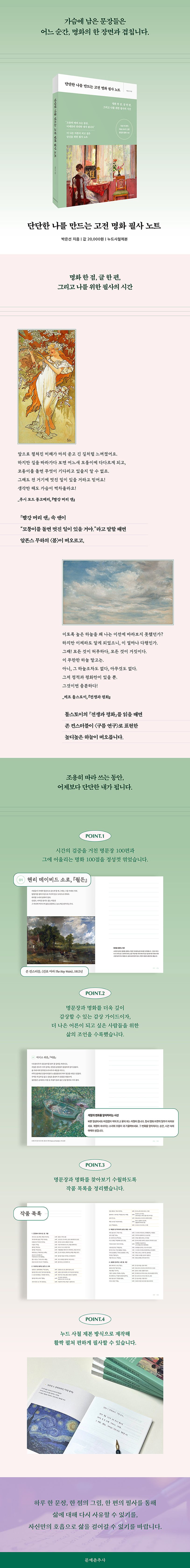 베스트셀러 작가이자 현직 교사인 저자 박은선은 앞날이 막막할 때면 그림을 보거나 책을 펼친다고 한다. 오랫동안 많은 사람들에게 사랑받아온 문장들 속에서 마음을 붙들어주는 말들을 수집하다 보면, 가슴에 남은 문장들이 어느새 머릿속에 켜켜이 쌓여 있던 명화의 한 장면과 겹친다고 이야기한다. 명화 한 점, 글 한 편, 그리고 필사의 시간을 통해 삶에 대해 다시 사유할 수 있기를, 자신만의 호흡으로 삶을 걸어나갈 수 있기를 바란다.
