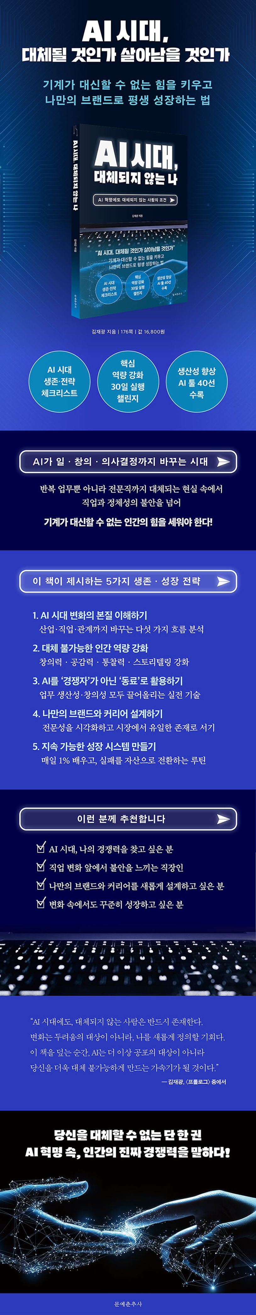 AI 시대는 인간을 대체하려는 것이 아니다. 오히려 인간의 ‘진짜’를 더 선명하게 드러내는 시대다. 변화는 두려움의 대상이 아니라, 나를 새롭게 정의할 기회다. 이 책을 덮는 순간, 독자들은 AI를 더 이상 공포의 대상으로 여기지 않게 될 것이다.