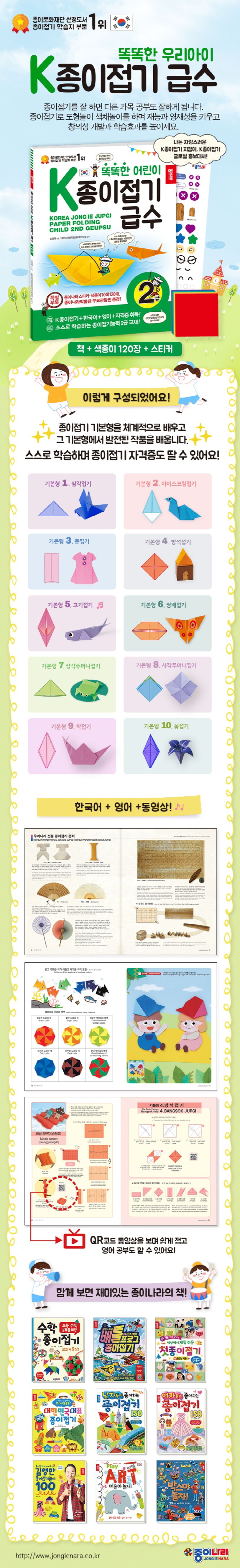 이 책은 종이문화재단에서 시행하는 어린이 급수종이접기 ‘3급→2급→1급(마스터)’ 자격 중에서 2급 대비를 위한 교재이다. 종이접기 기본형 10개 중에서 『똑똑한 어린이 K종이접기 2급』 교재에서는 10가지의 기본형을 소개하고 그 기본형에서 발전된 작품들을 소개한다. 화보를 구성하거나 종이접기 스크랩을 붙이는 등 다양한 방법으로 종이접기의 기초를 스스로 익힐 수 있도록 구성하였다. 본문 구성이 한글과 영어로 표기되어 있어 어린이들의 영어 학습에도 도움을 주며 까다로운 부분도 QR코드 동영상을 제공하여 쉽게 배울 수 있도록 하였다.