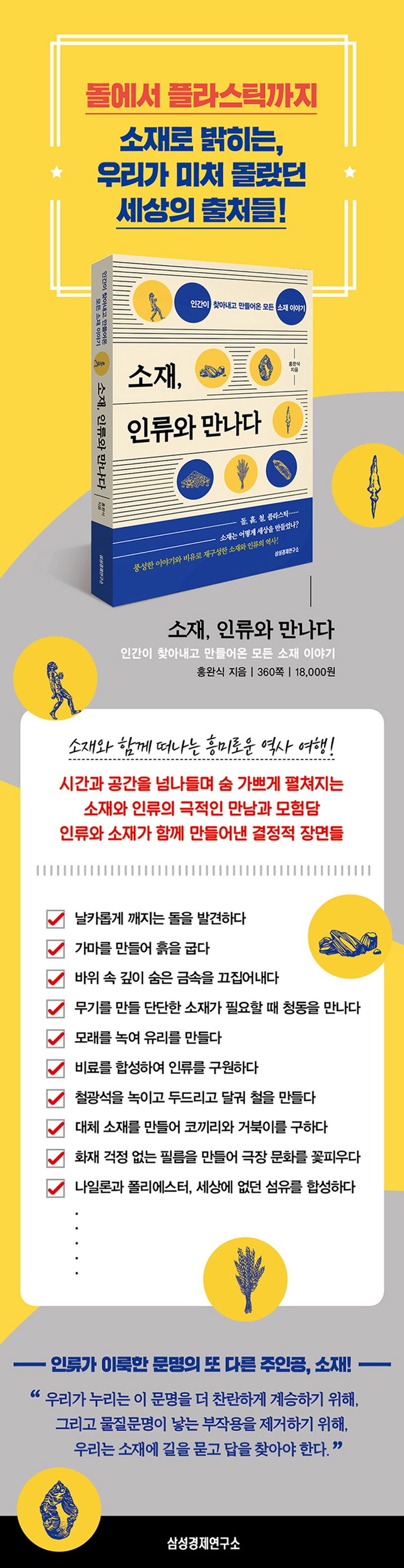 우연히 눈에 띄는 소재를 발견하여 쓰기 시작했던 아득히 먼 옛날부터 세상에 없던 소재를 직접 합성하여 쓰는 현재에 이르기까지 상상력과 역사적 사실, 과학적 근거 등을 최적의 비율로 조합해 재구성한 이 책은 2017년 한국대학교육협의회가 주최한 교양기초교육 우수교과목 공모전에서 자연 및 과학 부문에 선정된 ‘소재와 인류문명‘ 교안을 모체로 집필되었다.