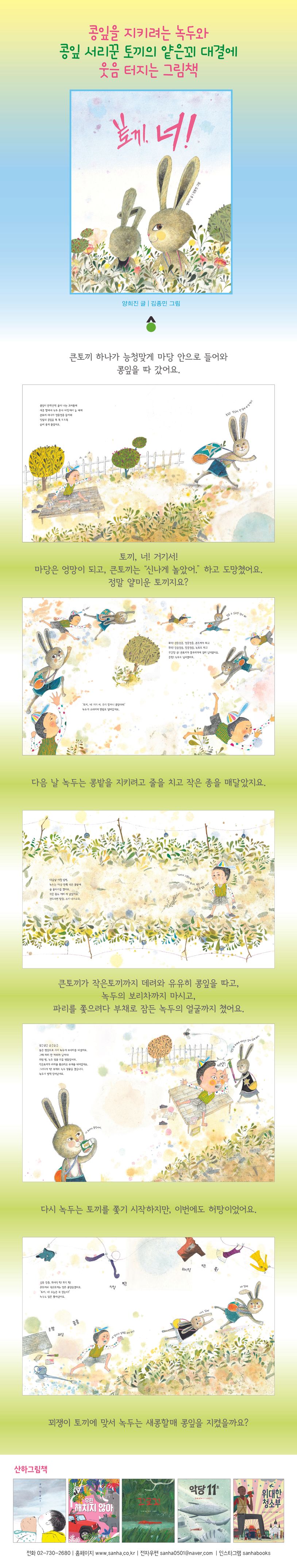 녹두가 마당 평상에서 혼자 놀고 있는데, 큰토끼 하나가 능청맞게 마당 안으로 들어와 콩잎을 따갑니다. 녹두가 큰토끼를 쫓는데 마당만 엉망이 되고, 큰토끼는 “신나게 놀았어.” 하고는 도망치지요. 신나게 놀았다니, 참 너무 얄미운 토끼입니다.