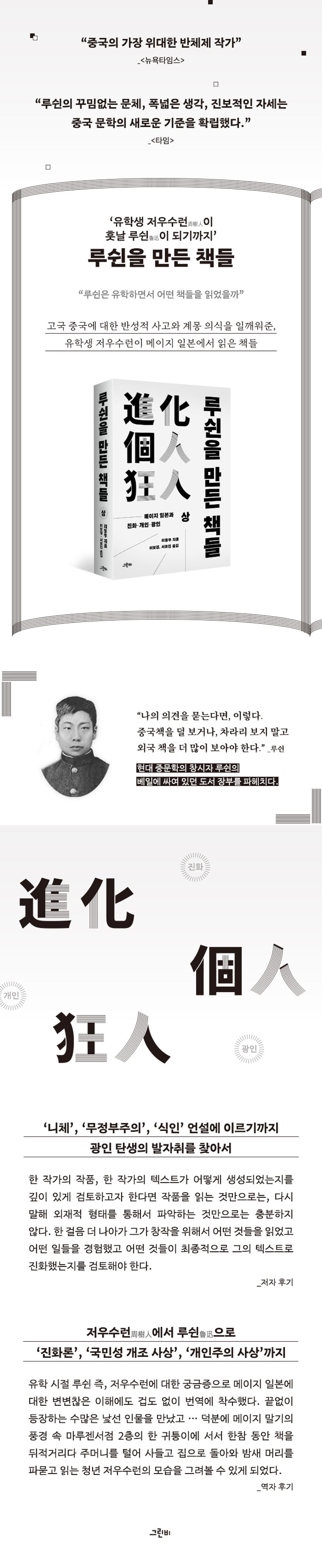 원제가 『월경越境-‘루쉰’의 탄생』인 이 책은 청년 저우수런이 메이지 일본에서 자신의 경계, 시대의 경계를 넘어 ‘루쉰’으로 탄생하기까지의 과정을 ‘루쉰의 독서 이력’이라는 키워드로 그리고 있다. 그런데 원서의 분량이 상당하여 상하 권으로 분권하게 되었고, ‘메이지 일본과 진화 개인 광인’이라는 부제로 상권을 먼저 출간한 것이다. 이후 출간할 하권의 부제는 ‘메이지 일본과 국민성’으로 이 역시 기대해도 좋을 것이다.