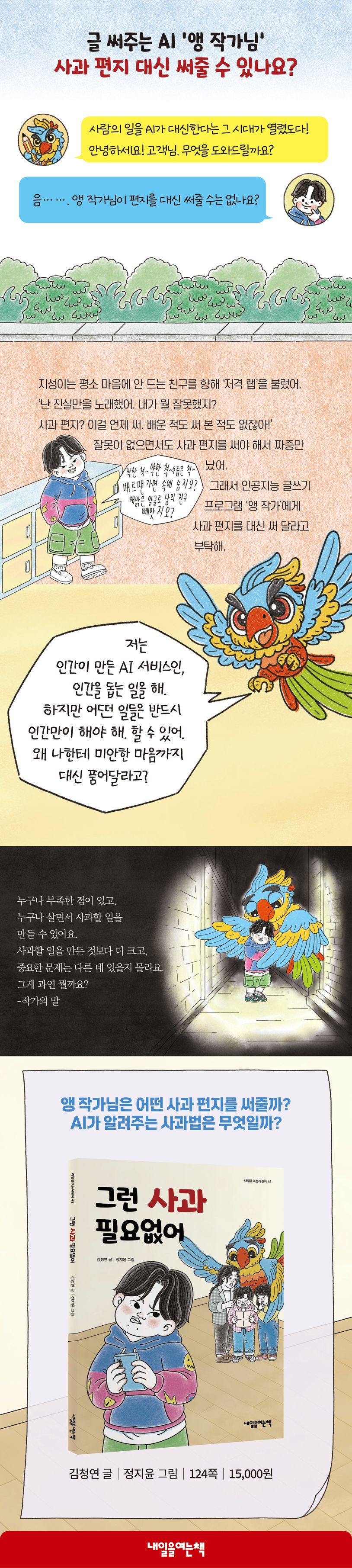 사과 편지를 AI 글쓰기 프로그램에 맡기면서 일어나는 에피소드가 흥미롭게 펼쳐진다. 지성이는 자신의 행동이 친구의 마음을 아프게 했다는 것을 알지 못하며, 사과 편지를 억지로 써야 하는 상황이 마음에 들지 않는다. 지성이는 자신의 진심을 담아야 하는 ‘사과 편지 쓰기’를 AI로 손쉽게 해결하려다 곤란해지지만, 다행히 AI ‘앵 작가’와 소통하며 해법을 찾아나가고 친구와도 화해에 이르게 된다. 하지만 지성이의 변화를 이끌어낸 ‘앵 작가’는, 스스로 해야 하는 일들까지 AI에게 맡기는 ‘인간’들에 대한 실망을 표현한다. 아무리 AI 시대라지만 세상에는 사람만이 할 수 있고 반드시 사람이 해야 하는 일이 있다는 ‘앵 작가’의 지적은 우리에게 생각할 거리를 안겨 준다. 모두가 인공지능의 편리함만을 이야기하는 이 시대에 우리가 놓치고 있는 것은 없는지 재미있는 이야기로 일깨워준다.