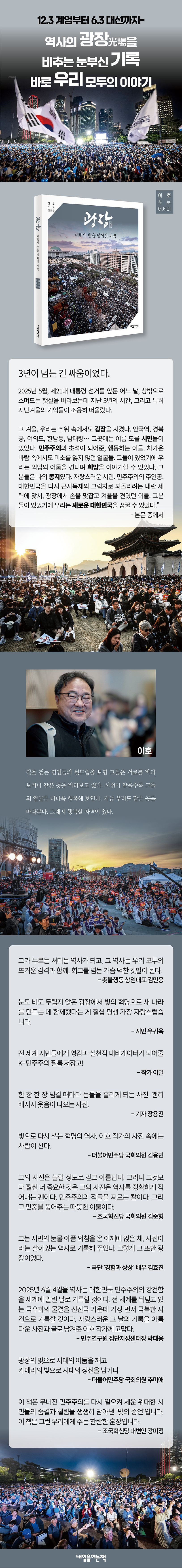 그런의미에서《광장》은우리현대사민주주의를향한여정의소중한사료가된다.거리의사관,광장光場의사관,이호작가의사진속에서살아숨쉬는민주주의를만나보자.광장에서뜨겁게표출되는민의를오롯이느껴보자.그의사진속‘우리’가곧역사다!