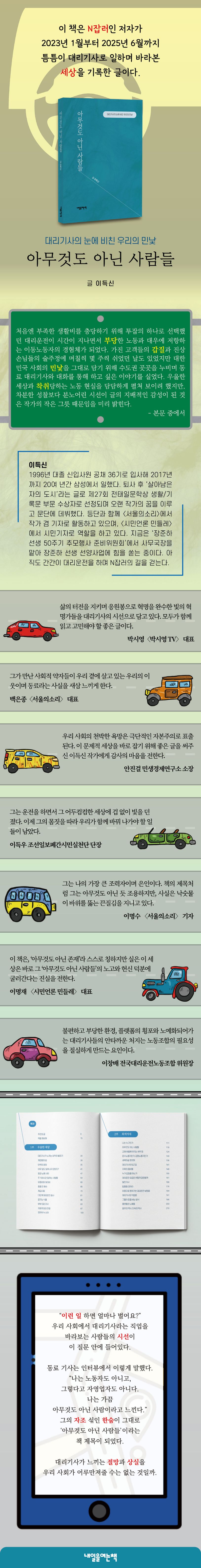 추천의글책을펴내며1부우울한세상-대리기사가느끼는최악의불경기-계엄령의밤-탄핵의광장-아무일도일어나지않았다?-왕과노예사이-주100시간일하는사람들-유흥비와대리비-총을든예수-계급사회-다단계대리운전회사-꿈꾸는식물-부부대리기사-자본주의의만행-엄마야누나야2부회색지대-나는누구인가-아무것도아닌사람들-고래싸움에터지는새우등-운수노동자인가,감정노동자인가-새벽이슬맞으며-대리기사의퇴근길-지옥의좀비들-누가갑질을하는가-대리운전요금은어떻게결정될까-월천기사-밥줄을끊어라-이중으로뜯어가는대리운전보험료-대리기사의직업병-그들이돈을버는방식-플랫폼의노예들-음주의역사,단속의역사