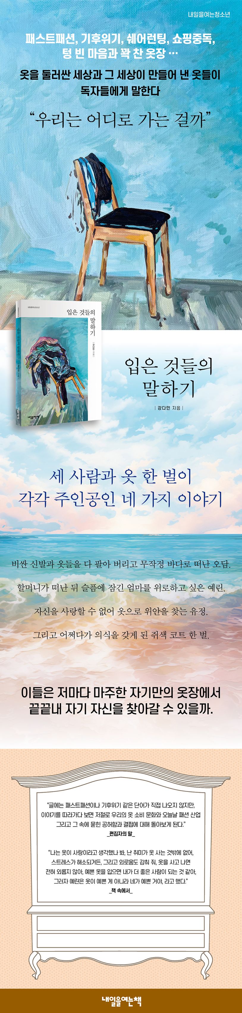 답답함, 불안, 질투, 원망, 섭섭함, 슬픔 같은 감정이 주변 이들과의 관계를 통해 다른 감정으로 변해 가는 이야기 속에서 자연스럽게 ‘우리가 입은 것들’에 대하여 다르게 생각할 기회를 얻을 수 있는 소설이다. 누군가는 옷을 입었을 뿐이지만 그 일로 누군가는 해를 입고, 누군가는 은혜를 입고, 또 누군가는 혜택을 입기도 한다. 이 책을 통해 오늘 우리가 입은 옷을 보며 ‘입은 것들’을 생각해 보면 좋겠다.