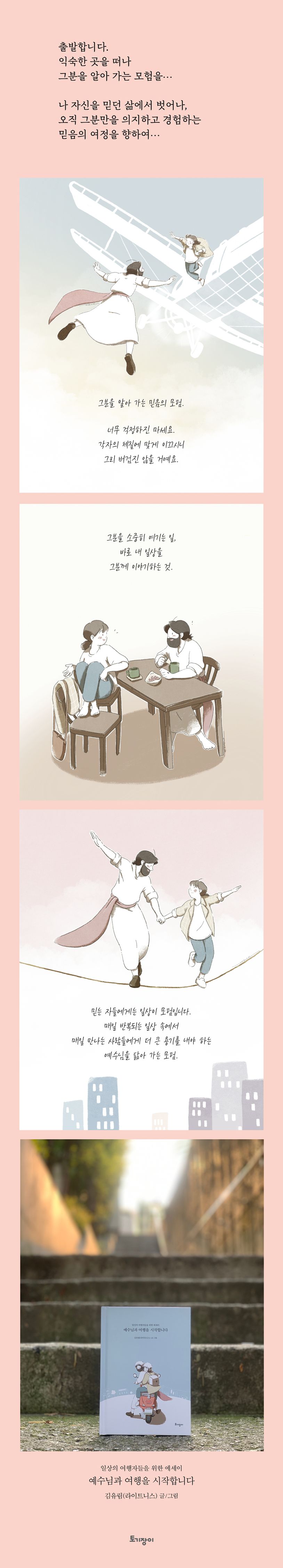 우리는 모두 여행자다. 실제로 멀리 여행을 떠나기도 하지만, 일상에서도 새로운 낯선 곳으로 한 걸음씩 나아가는 여행을 끊임없이 하며 살아간다. 「예수님과 여행을 시작합니다」는 그러한 일상의 여행자들에게 따뜻한 위로를 건네는 책이다. 여행을 결심하고, 준비하고, 떠나고, 돌아보는 과정을 짧은 글과 일러스트로 표현한 이 책은 여행에 대한 기대와 설렘, 그 과정에서 겪는 절망과 좌절, 그리고 그 속에서 경험했던 예수님의 마음을 따뜻하고 섬세하게 보여 준다.
