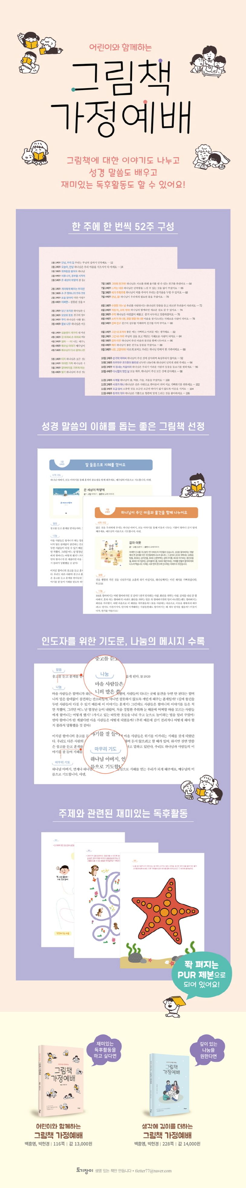 아이들이좋아하는그림책으로온가족이즐겁게드리는가정예배그림책에대한이야기도나누고성경말씀도배우고재미있는독후활동도할수있어요!어린이의눈높이에맞춘‘그림책’과‘가정예배’의만남어린이가매일접하는그림책으로가정예배를드리는것만큼즐거운일이있을까?이책은전문가가엄선한좋은그림책을읽으며자연스럽게하나님의말씀을배울수있도록돕는다.또한시작기도,말씀,나눔,마무리기도가자세히안내되어있어부모가특별한준비없이도가정예배를인도할수있다.말씀을마음에새기는다양한독후활동나눔이끝난뒤에는,이야기를바탕으로한다양한독후활동이구성되어있다.가족과이야기를나누고,한번더생각한것을그림으로그리고,재미있는문제를풀면서아이들은앞서배운하나님의말씀을마음에깊이새길수있을것이다.★이책의특징한주에한번씩,52주구성그림책과성경말씀을연계한독서형가정예배성경말씀의이해를돕는좋은그림책선정인도자를위한기도문,나눔의메시지수록주제와관련된재미있는독후활동부활절,성탄절,설날,추석등절기반영★독자대상자녀와함께가정예배를드리고싶은가정그림책을통해기독교세계관을키워주고싶은부모주제설교시그림책을예화로활용하기원하는교역자