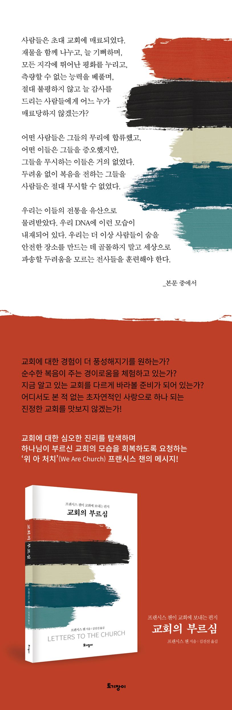 프랜시스 챈 목사는 자신의 그 어떤 책보다 뜨거운 열정으로 쓴 이 책에서 하나님이 원래 계획하셨던 교회의 부르심에 집중하도록 도전한다. 그리고 교회가 한때 얼마나 강력했고 얼마나 찬란했었는지를 일깨운다. 지금 우리가 경험하고 있는 교회는 어쩌면 하나님이 원하시던 교회 본연의 모습에서 너무 멀리 이탈해 있을 수도 있다.