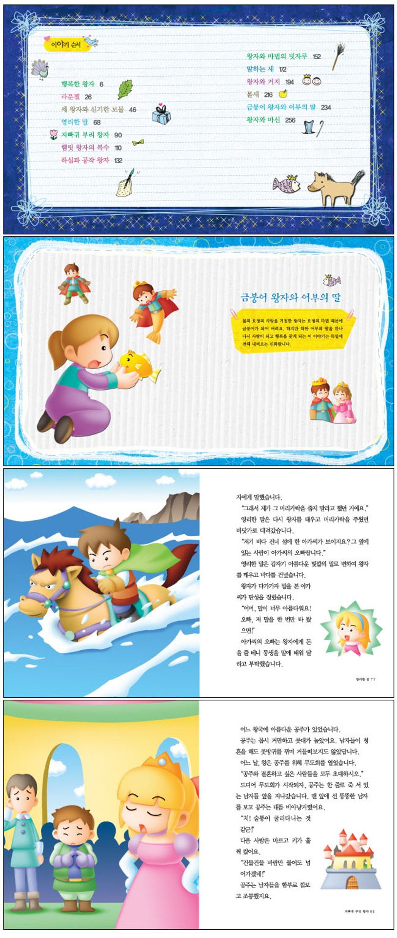 쌍둥이처럼 닮은 왕자와 거지가 옷을 바꾸어 입었다가 벌어지는 재미있는 모험을 담아낸 〈왕자와 거지〉, 자신의 몸을 장식한 금과 보석을 가난한 사람에게 떼어준 행복한 왕자 동상의 감동적인 이야기를 들려주는 〈행복한 왕자〉, 그리고 금붕어 왕자가 마음 착한 어부의 딸의 도움을 받아 물의 요정의 마법에서 풀려나면서 생겨난 흥미로운 사건사고로 초대하는 〈금붕어 왕자와 어부의 딸〉 등으로 구성했습니다. 양장본.