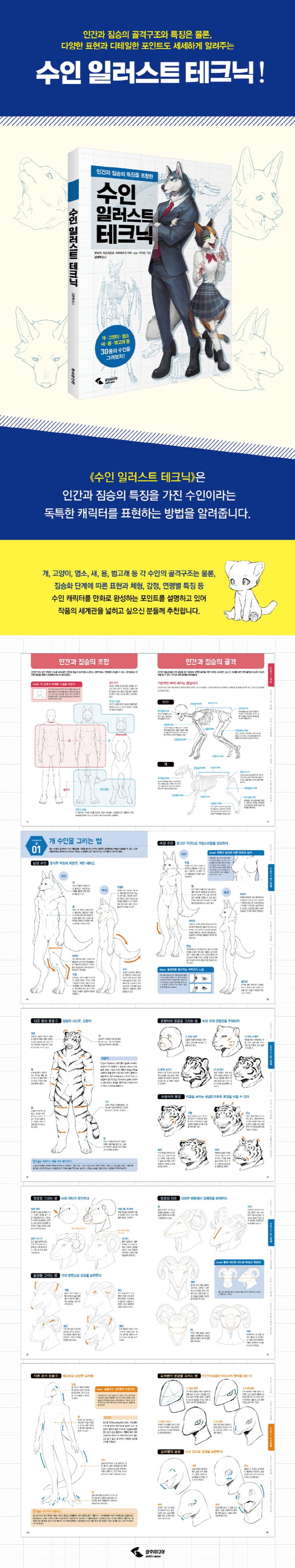 판타지 작품에서 자주 등장하는 수인 캐릭터. 수인은 미노타우로스나 늑대인간처럼 반은 인간이고 반은 짐승인 캐릭터를 말합니다. 인간과 동물의 특징을 가지고 있는 수인은 각각의 특징을 잘 배분해서 표현해야 하므로 그리기가 까다롭습니다. 《수인 일러스트 테크닉》은 먼저 인간과 짐승의 골격과 특징을 알아보고 이를 어떻게 조합해야 할지를 설명합니다. 캐릭터를 완성하는 설명은 형태 잡기부터 세세하게 설명하여 초보자도 알기 쉽게 하였고, 인간이 점점 짐승화되어감에 따라 신체가 어떻게 변화하는지 단계별로 설명하여 표현의 포인트를 잘 이해할 수 있게 하였습니다. 이 책은 개, 고양이, 염소, 새, 용, 범고래 등 개성이 다른 수인을 6가지로 분류하고, 그로 인해 파생되어 나올 수 있는 수인을 소개하여 총 30종의 수인을 다루고 있습니다. 수인의 표정 변화와 체격에 따른 표현, 아이부터 성인까지 표현하는 방법도 설명하고 있어 작품의 세계관을 넓히고, 좀 더 다양한 표현을 하고 싶으신 분들께 도움이 될 것입니다.