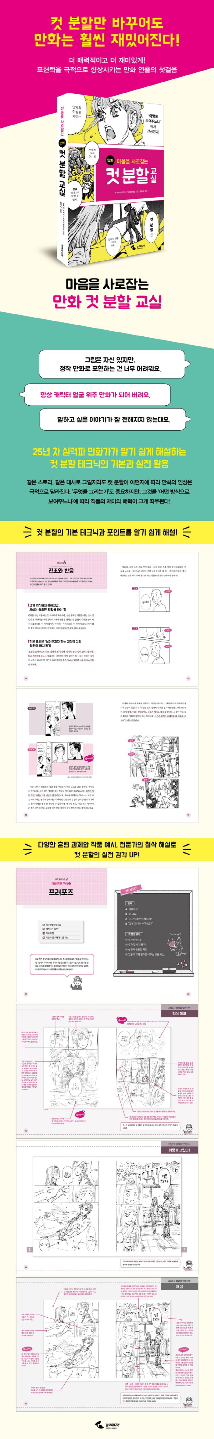 여타 이론 중심의 작법서와 달리 《마음을 사로잡는 만화 컷 분할 교실》이 지닌 가장 큰 장점은, 독자 스스로 부족한 부분을 구체적으로 인지하고, 보완·발전시키도록 유도하는 실천적인 책이라는 점이다. 흥미를 유발하는 과제에 적극적으로 도전하고, 다양한 사례와 첨삭 해설을 접하는 경험을 통해 컷 분할 활용의 실전 감각을 자연스럽게 기를 수 있을 것이다.