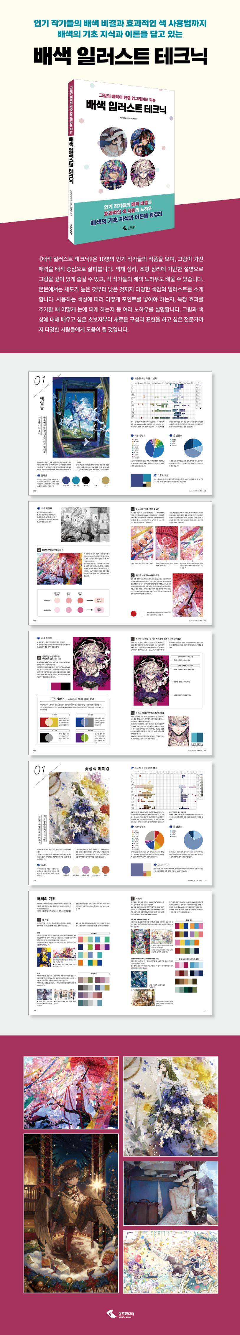 《그림의 매력이 한층 업그레이드되는 배색 일러스트 테크닉》은 10명의 인기 작가들의 작품을 보며, 그림이 가진 매력을 배색 중심으로 살펴봅니다. 색채 심리, 조형 심리에 기반한 설명으로 그림을 깊이 있게 즐길 수 있고, 각 작가들의 배색 노하우도 배울 수 있습니다. 본문에서는 채도가 높은 것부터 낮은 것까지 다양한 색감의 일러스트를 소개합니다. 사용하는 색상에 따라 어떻게 포인트를 넣어야 하는지, 특정 효과를 추가할 때 어떻게 눈에 띄게 하는지 등 여러 노하우를 설명합니다. 그림과 색상에 대해 배우고 싶은 초보자부터 새로운 구성과 표현을 하고 싶은 전문가까지 다양한 사람들에게 도움이 될 것입니다.
