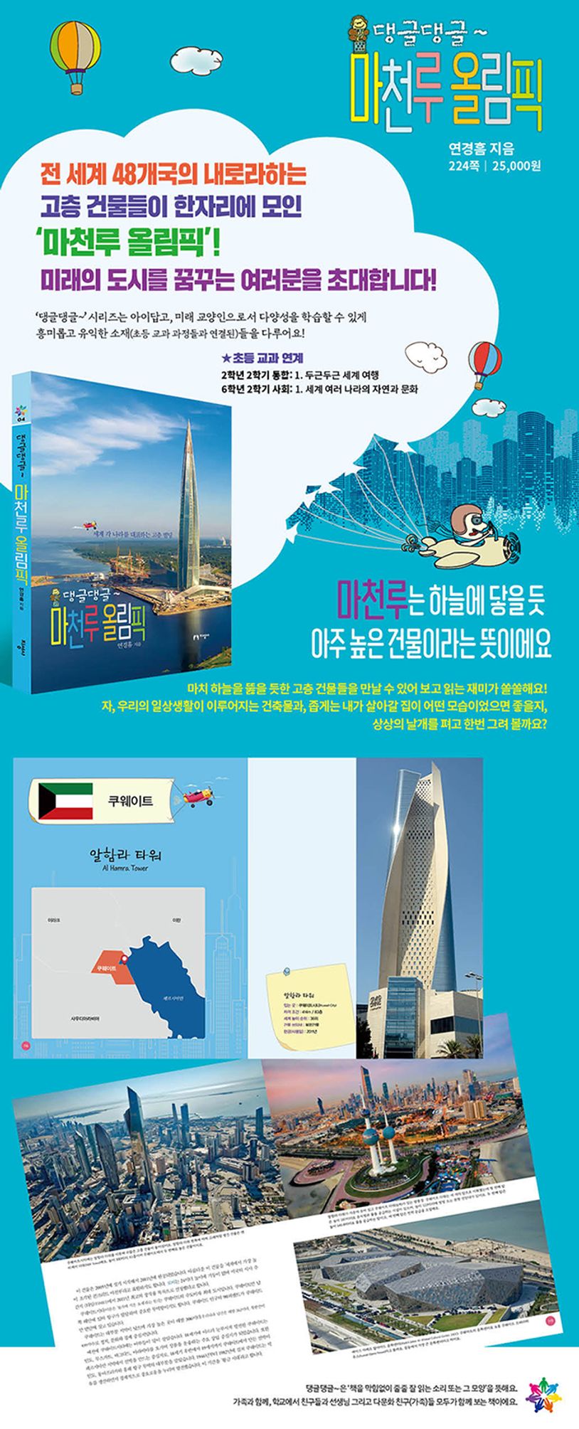 마천루(닿을 ‘마摩’, 하늘 ‘천天’, 층집 ‘루樓’)는 하늘에 닿을 듯 아주 높은 건물이라는 뜻이에요. 전 세계 48개국에서 각 나라를 대표하는 고층 건물들이 한자리에 모여 저마다의 개성을 한껏 뽐내는 마천루 올림픽! 이 올림픽에 참가할 수 있는 고층 건물의 자격은 사람들이 그곳에 머물며 살고 있거나 일하는 공간, 또 그곳에서 생활에 필요한 물건을 사거나 여가를 즐기는 따위로, ‘늘 사람들이 관계를 이어가며 생활하는 건물’이어야 한다는 점이에요. 이에 곁들여 각 나라의 역사와 문화를 간직한 건물들도 둘러볼 수 있지요. 높이 더 높이, 마치 하늘을 뚫을 듯한 세계 50위에 속하는 고층 건물들도 만날 수 있어 보고 읽는 재미가 쏠쏠해요. 자, 우리의 일상생활이 이루어지는 건축물과, 좁게는 내가 살아갈 집이 어떤 모습이었으면 좋을지, 상상의 날개를 펴고 한번 그려 볼까요?