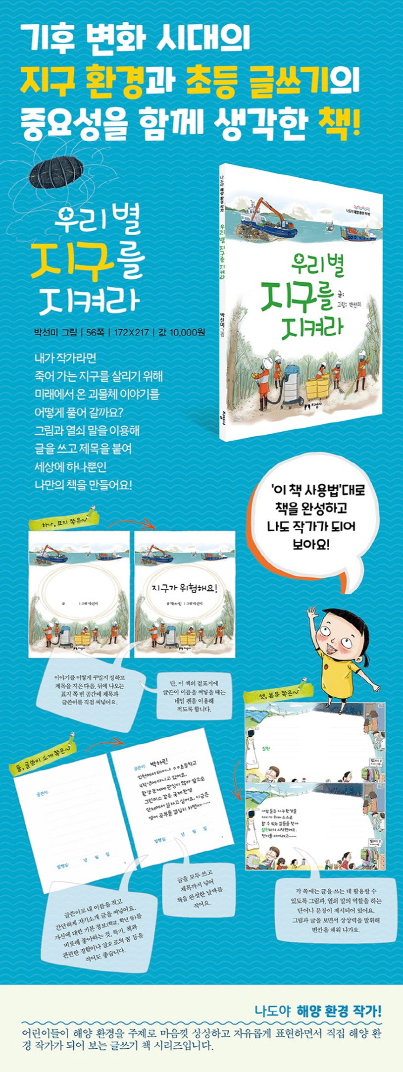기후 변화 시대를 살아가는 우리 어린이들이 바다를 비롯한 지구 환경을 주제로 마음껏 상상하고 자유롭게 표현하면서 직접 해양 환경 작가가 되어 보는 글쓰기 책 ‘나도야 해양 환경 작가!’ 시리즈의 책입니다. 초등 글쓰기의 중요성을 고려해 어린이들이 직접 작가가 되어 글을 써넣을 수 있게 한 글쓰기 책은 자기의 생각을 표현하는 과정을 통해 지혜를 얻고 더욱 성장할 수 있도록 구성하였습니다.