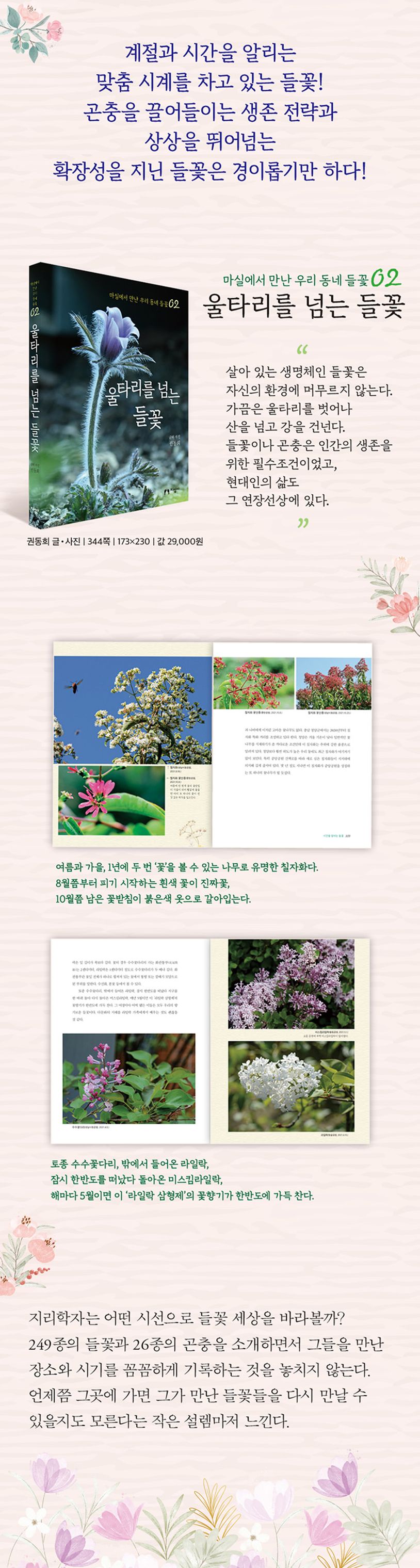 동네 길을 걸으면서 들꽃을 만나고, 그들과 눈을 맞추며 행복한 자연 몰입 과정을 담은 들꽃 산책 기록이다. 사계절을 오롯이 품은 자연의 생명살이에 관심을 갖는다면 새로운 세상이 펼쳐지고, 누구나 자연철학자가 될 수 있다. 반나절 거리의 동네 마실에서 이런저런 들꽃을 만나는 과정은 곧 보물찾기와 같다. 매일매일 설레는 마음으로 마실 여행에서 만난 보물과 같은 들꽃 가운데 시간을 알리는 들꽃, 장소를 가리는 들꽃, 곤충을 부르는 들꽃, 울타리를 넘는 들꽃에 얽힌 이런저런 이야기에 정겨움이 흐른다.