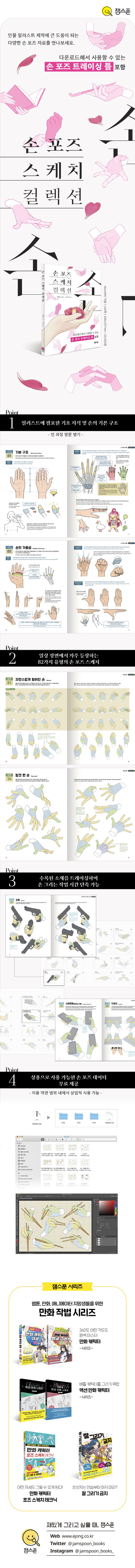 이 책은 총 4개의 챕터로 구성되어 있으며, 챕터 1에서는 기본적인 손의 구조를 해설합니다. 나머지 챕터에는 상황별로 손 포즈가 게재되어 있습니다. 팁으로 활용할 수 있는 주석도 많이 실려있으므로 데이터와 함께 참조해 보기 바랍니다.