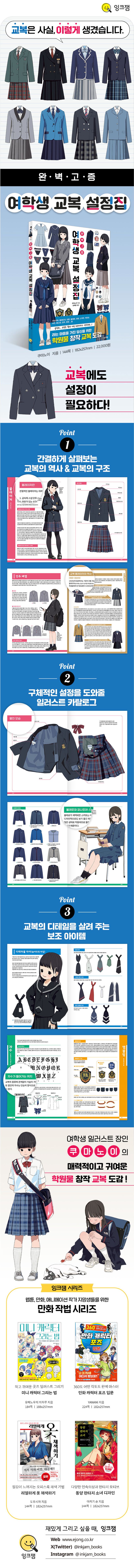여학생 일러스트의 장인 쿠마노이의 교복 설정집이다. 이 책은 교복의 역사, 종류별 세부 구조를 알기 쉽고 자세하게 설명한다. 다양한 형태의 여학생 교복 일러스트로 구체적인 캐릭터 설정의 아이디어를 얻을 수 있다. 창작물의 디테일을 더욱 살리고 싶다면 교복과 어울리는 보조 아이템을 참고해 보자. 페이지마다 이어지는 쿠마노이의 매력적인 여학생 일러스트는 즐거운 영감을 불러일으킨다.