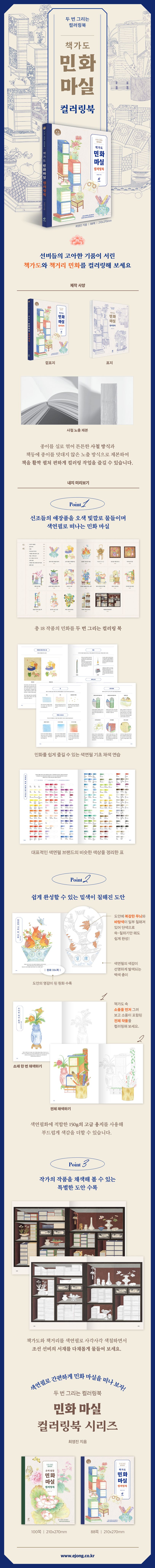 『오색 빛깔 민화 마실 컬러링북』에 대한 독자들의 사랑과 성원에 힘입어 두 번째 책 『책가도 민화 마실 컬러링북』이 출간되었습니다. '책가도(冊架圖)'는 책장과 서책을 중심으로 각종 문방구와 도자기, 화훼, 기물을 함께 그린 그림입니다. 궁중회화로 유행하던 책가도는 사대부, 민간의 회화로 확산되면서 서민들의 염원과 실생활을 담은 '책거리'로 크게 성행했습니다. 이 책은 이러한 책가도와 책거리를 주제로 한 책입니다. 민화 속 서책과 멋스런 소품들은 지금 보아도 세련되고 감각적입니다. 책가도와 책거리를 색연필로 사각사각 색칠하면서 조선 선비의 서재를 다채롭게 물들여 보세요.