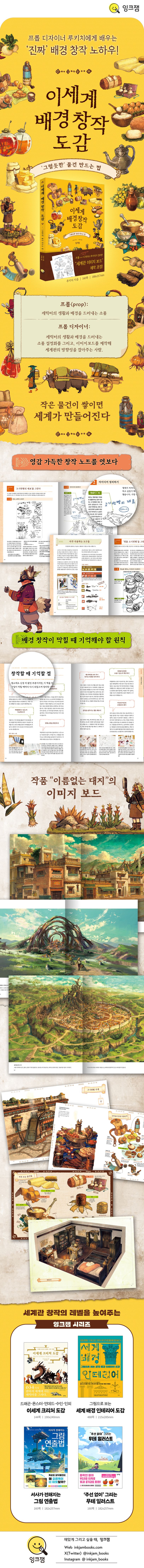 『이세계 배경 창작 도감』은 게임, 애니메이션 분야에서 컨셉 아티스트 및 배경 디자이너로 실력을 쌓아온 저자 루키치가 10대 시절부터 상상했던 세계와 창작 노하우를 담은 책이다. 소품을 중심으로 장소와 풍경, 방 구조, 캐릭터 설정 노트 등 다양한 장면을 그려 낸 루키치의 세계는 구석구석 디테일이 살아 있어 들여다볼수록 감탄을 자아낸다. 나만의 세계를 상상하고 구현할 때 작은 것 하나에도 서사가 자연스럽게 드러나기를 바란다면, 이 책에 담긴 저자의 섬세한 아이디어와 노하우를 살펴보자. 작품의 컨셉 구상과 배경 작화에 어려움을 느끼는 이들에게, 상상의 폭을 넓히고 자신의 작업에 알맞게 적용할 수 있도록 길을 열어 줄 것이다.
