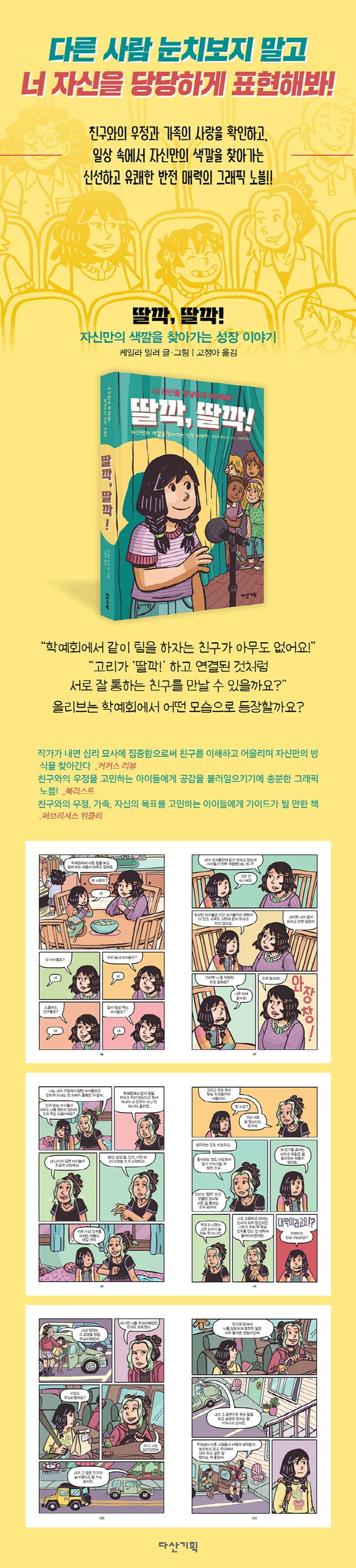 『딸깍, 딸깍!』은 주인공 올리브가 친구와의 관계와 우정을 고민하고, 그 속에서 자신의 색깔을 찾고 해결해가는 성장 과정을 경쾌하고 진솔하게 그려낸 그래픽노블이다. ‘딸깍, 딸깍!’은 고리가 ‘딸깍’하고 연결된 것처럼 마음이 딱 맞는 베프의 의미, 고민 과정에서 스위치가 ‘딸깍’하고 켜지면서 뭔가 생각의 변화가 생기고 해결되는 순간 등 여러 가지 의미를 함축하고 있다.
