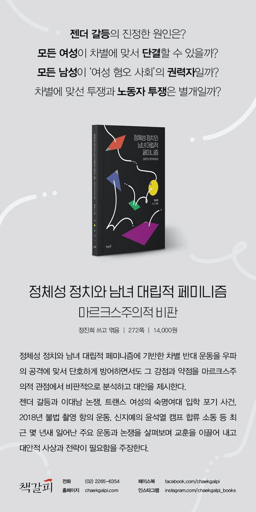 특히 정체성 정치와 남녀 대립적 페미니즘의 강점과 약점을 국내 여성운동의 경험 속에서 살펴본다는 것이 특징이다. 이를 위해 젠더 갈등과 이대남 논쟁, 트랜스 여성의 숙명여대 입학 포기 사건, 2018년 불법 촬영 항의 운동, 신지예의 윤석열 캠프 합류 소동 등 최근 몇 년새 일어난 주요 운동과 논쟁을 살펴보며 교훈을 이끌어 내고 대안적 사상과 전략이 필요함을 주장한다.