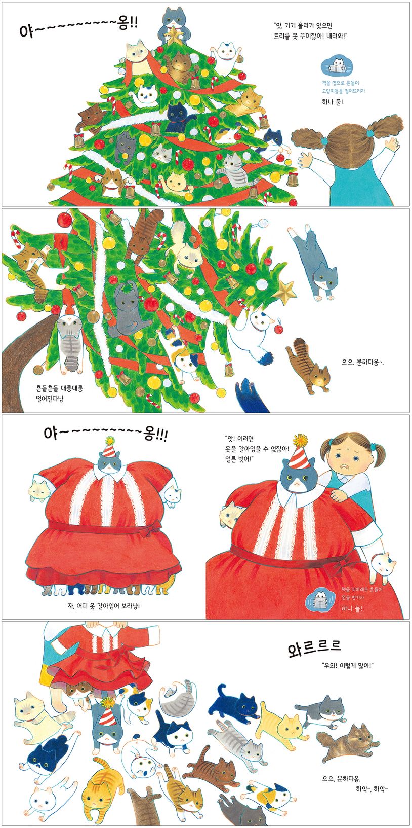 그런데 함께 사는 고양이 가족이 방해해요. 파티 장소 곳곳에 숨어 있거나, 크리스마스트리에 매달리고, 파티복을 빼앗아 입거나, 모모가 움직이지 못하게 우르르 모여 있어요.